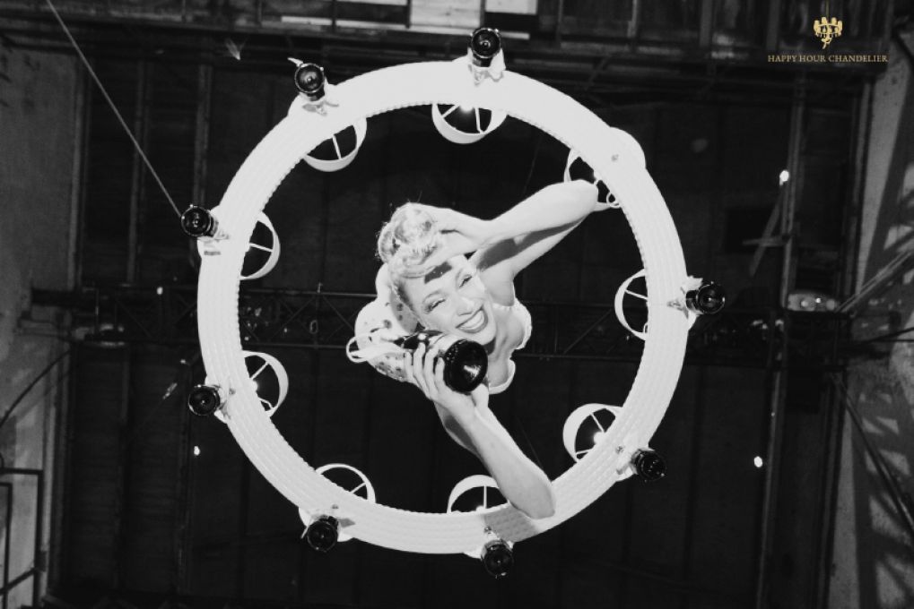 Happy Hour Chandelier is a 20 minutes’ performance by a Dancing Angel who is hanging (upside down!) from the ceiling above her audience surrounded by a beautifully designed chandelier. While hanging through the chandelier she dances a magical choreography and pours champagne into flutes to the crowd beneath her. Happy Hour Chandelier brings a spectacular sparkle to your celebration and leaves a long-lasting impression.